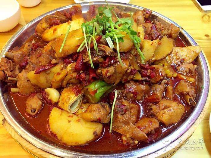 相传解放前期,一位四川烹饪高手为躲避战乱,来到新疆落户。他开了一家小饭馆,以卖炒面、拌面为生,生意时好时坏。八十年代初的一天,一位长途汽车司机来到他的小店吃饭,随口给张师傅说:‘炒面、拌面太干,你给我炒一份辣子鸡,多放些汤,再给我拉一些面拌在一起’。这句话提醒了张师傅,于是一传十,十传百,这道菜变成了响誉全国的大盘鸡。新乡小吃培训学校大盘鸡升级,创新药膳大盘鸡,采用上等三黄鸡和十多种大料,另配有多种清热去火名贵药材小火煨制而成,味型独特,香辣味浓,麻的过瘾,辣的享受,选料精细,配方讲究,中药配比,不易上火,老少皆宜。鸡肉嫩香入味,土豆软糯,丝丝甜味侵入汤汁,原汁原味的大盘鸡,吃的健康、吃的美味。
