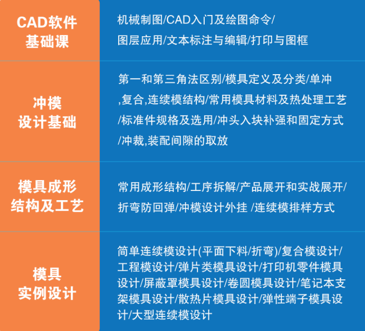 南通2D五金冲压模具设计培训班,在理论学习完成后,设置大型项目实训营。让学员真正接触、切身体会岗位所需技能,亲自动手参与项目开发、运作过程。帮助学员拥有自己真实的项目成果以及独立操作大型项目的能力。